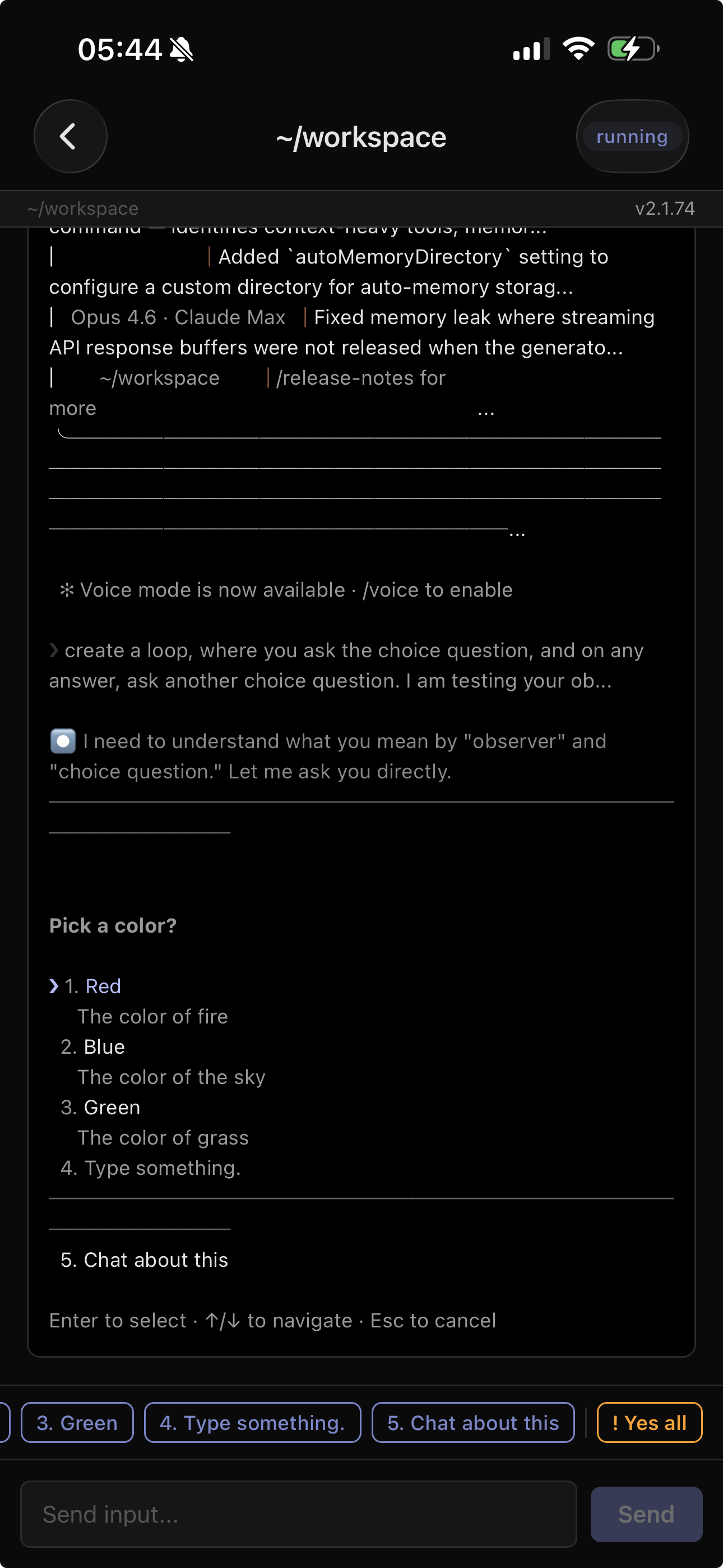 The most common way to enable auto-yes is from the mobile app. When a Claude Code agent asks a question and you get the notification card, you'll see option buttons at the bottom of the screen - the detected choices from the terminal prompt, plus a red "Yes all" button on the right.