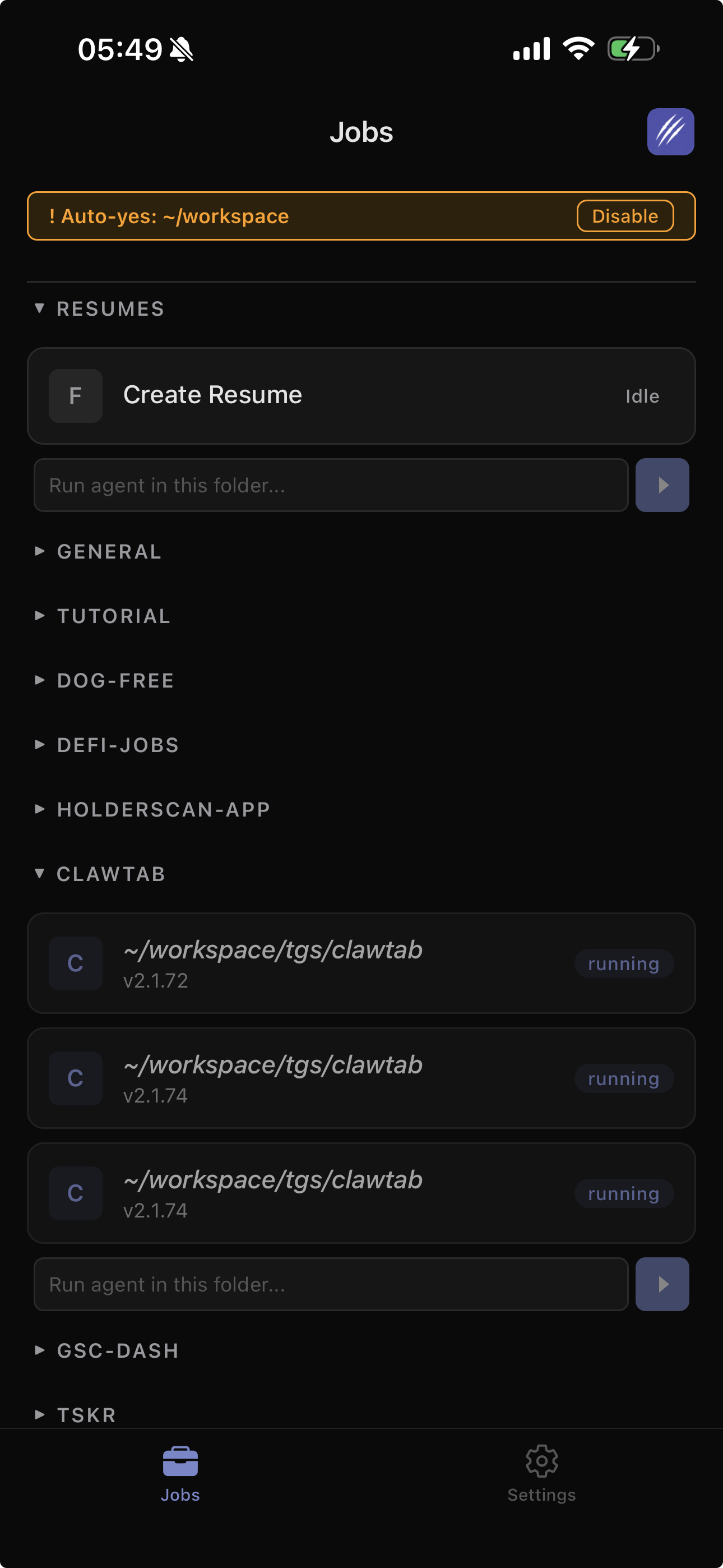 When auto-yes is active, a prominent banner appears at the top of the jobs list - both on mobile and on the desktop app. The banner shows the pane path (like "~/workspace") and a "Disable" button.