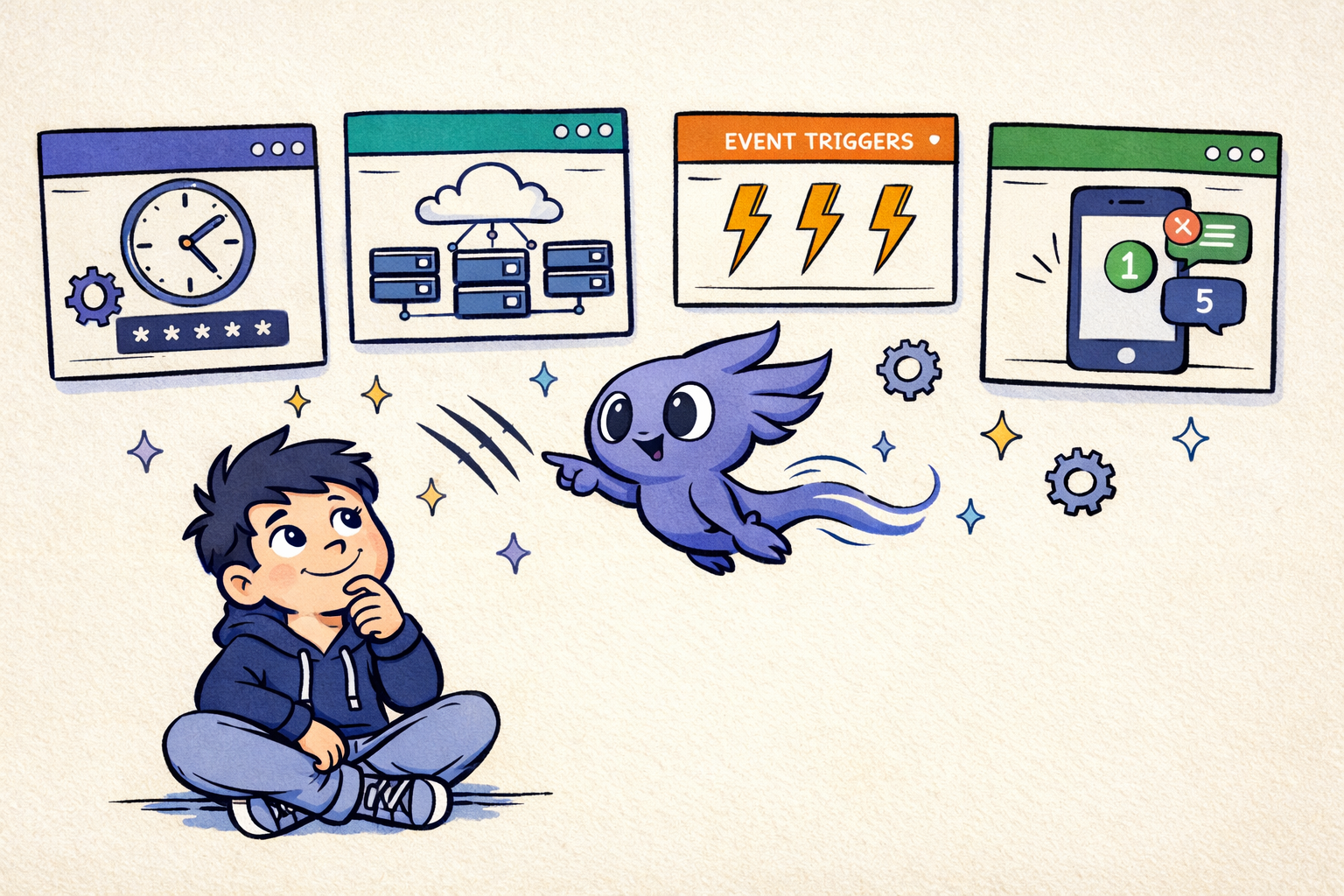 - Webhook triggers. React to external events, not just time-based schedules.