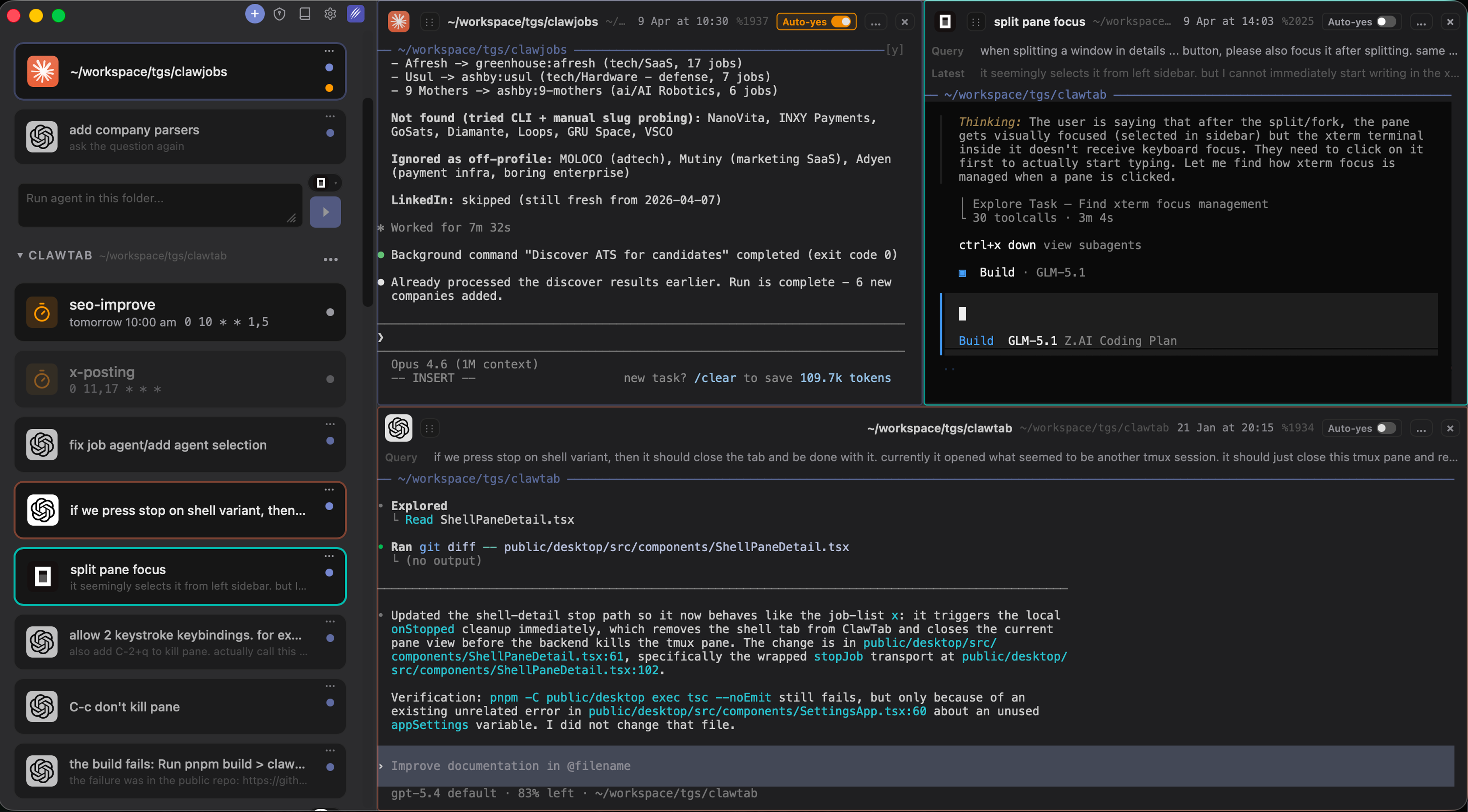 ClawTab sits above both: it's a desktop app that manages CLI-based agent sessions (Claude Code, Codex, OpenCode) across panes, handles scheduling, and gives you remote access from your phone. Think of it as the control plane that CLI tools are missing.