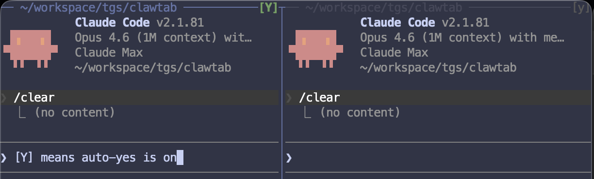 ![Two tmux panes side by side showing the auto-yes indicator - left pane has [Y] in green (enabled), right pane has [y] in dim gray (disabled)](https://cdn.clawtab.cc/assets/articles/tmux/auto-yes-indicator.png)