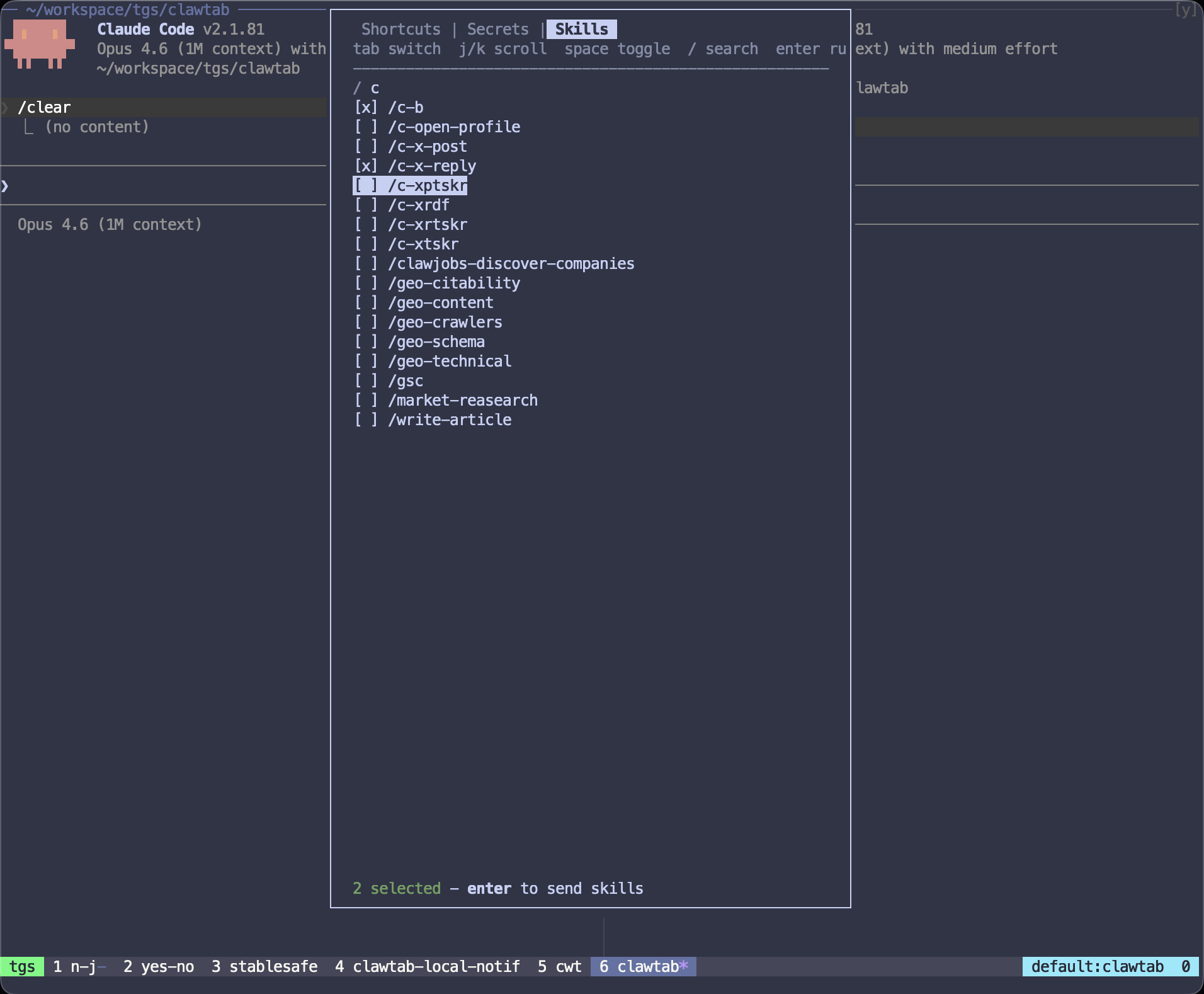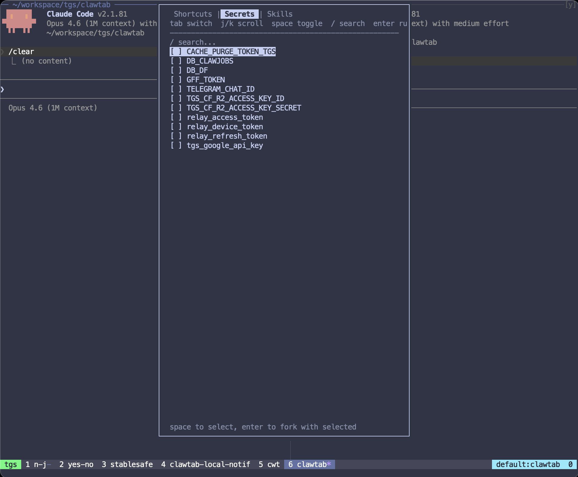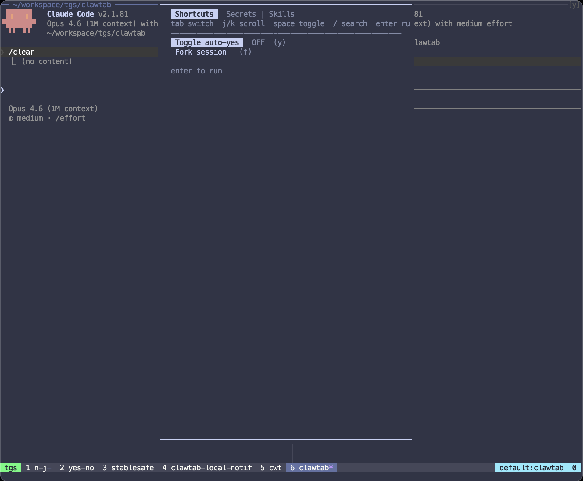 Press prefix + E to open the ClawTab popup. It's a tabbed TUI inspired by lazygit with three tabs: Shortcuts, Secrets, and Skills.